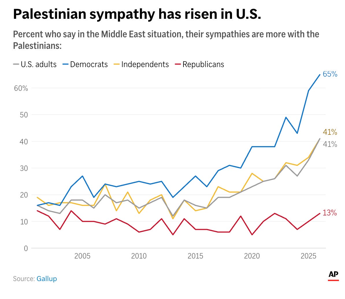 Democrats’ support for Palestinians rose from a low in 2013 of 19%, to a high today of 65% (3.42 times what it had been), while Republicans’ rose from 5% then, to 13% today (2.6 times what it had been). Among independents, it was 12% then and is 41% now (3.42 times what it had been — the exact same rise as among Democrats).